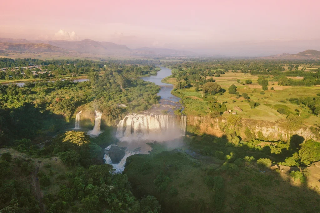 Known locally as Tis Isat – ‘Smoke of Fire’ the Blue Nile Falls is the most dramatic spectacle on either the White or the Blue Nile rivers. Four hundred meters (1,312 feet) wide when in flood, and dropping over a sheer chasm more than forty-five meters (150 Feet) deep the falls throw up a continuous spray of water, which drenches onlookers up to a kilometer away. This misty deluge produces rainbows, shimmering across the gorge, and a small perennial rainforest of lush green vegetation, to the delight of the many monkeys and multicolored birds that inhabit the area.